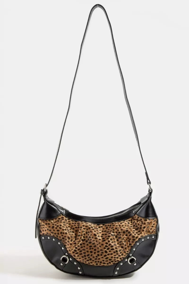 Elevate your accessory game with this Dark Spotted Leopard Print Half Moon Shoulder Bag, showcasing a bold and stylish design. The dark spotted leopard print adds a touch of fierce sophistication to your outfit, making a statement wherever you go. The unique half-moon shape of the bag adds a trendy twist to its overall appearance. Perfect for adding a touch of wild elegance to your look, this shoulder bag is both functional and fashion-forward. Step out in style with this chic and eye-catching leopard print shoulder bag that is sure to turn heads and elevate your ensemble.